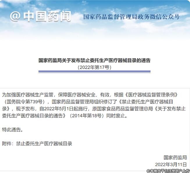 《禁止委托生產(chǎn)醫(yī)療器械目錄(2022年第17號)》是在法規(guī)和標準的不斷完善、科學(xué)技術(shù)的不斷發(fā)展之下進行的適時的調(diào)整?!赌夸洝返膶嵤?,將對降低相關(guān)產(chǎn)品不良事件、保障產(chǎn)品安全發(fā)揮出有益作用。