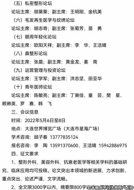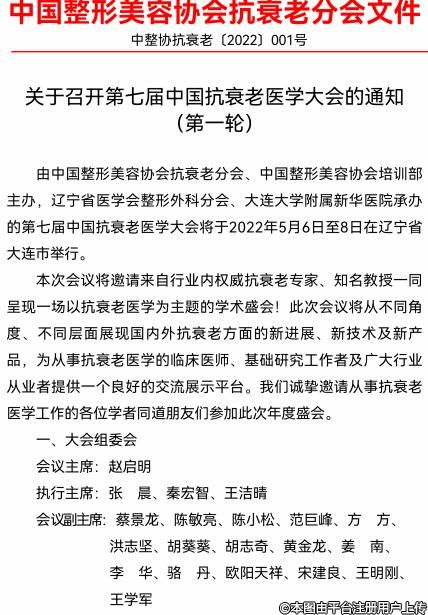 由中國(guó)整形美容協(xié)會(huì)抗衰老分會(huì)、中國(guó)整形美容協(xié)會(huì)培訓(xùn)部、遼寧省醫(yī)學(xué)會(huì)整形外科分會(huì)主辦,大連大學(xué)附屬新華醫(yī)院、大連醫(yī)科大學(xué)附屬一院承辦的第七屆中國(guó)抗衰老醫(yī)學(xué)大會(huì)將于2022年5月6日至8日在遼寧省大連市舉行。