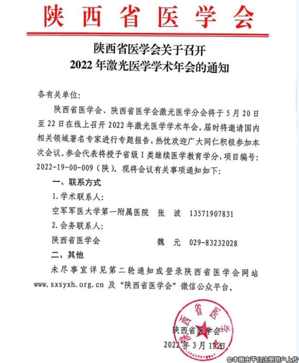 陜西省醫(yī)學(xué)會、陜西省醫(yī)學(xué)會激光醫(yī)學(xué)分會將于5月20日至22日在線上召開2022年激光醫(yī)學(xué)學(xué)術(shù)年會。屆時將邀請國內(nèi)相關(guān)領(lǐng)域著名專家進行專題報告,熱忱歡迎廣大同仁積極參加本次會議。參會代表將授予省級I類繼續(xù)醫(yī)學(xué)教育學(xué)分,項目編號:2022-19-00-009(陜)。現(xiàn)將會議有關(guān)事項通知如下: