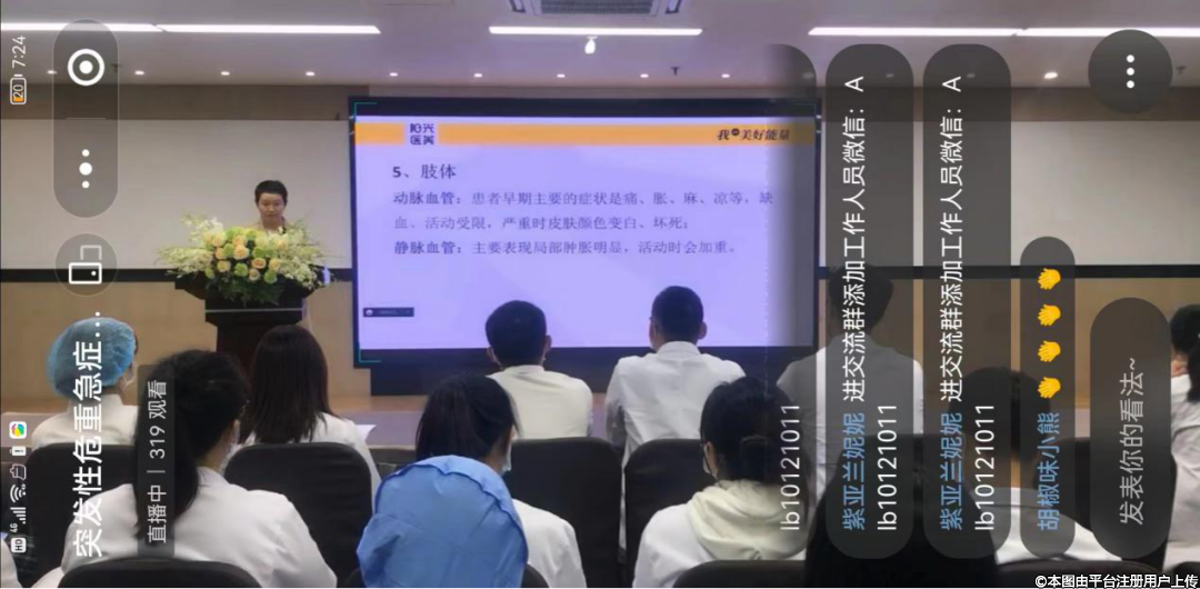 會上,美容外科脂肪整形專業(yè)組袁野主任和王學(xué)納護(hù)士長分別深入講解了《脂肪栓塞的預(yù)防、診斷、救治和應(yīng)急預(yù)案》、《空氣栓塞的預(yù)防、診斷、救治和應(yīng)急預(yù)案》。本次培訓(xùn)線上觀看學(xué)習(xí)人數(shù)共計381人,線下60多人,線上線下頻頻互動,氣氛熱烈,獲得了觀眾的一致好評。