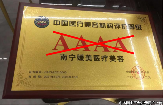 南寧媛美醫(yī)療美容偽造的4A等級牌匾