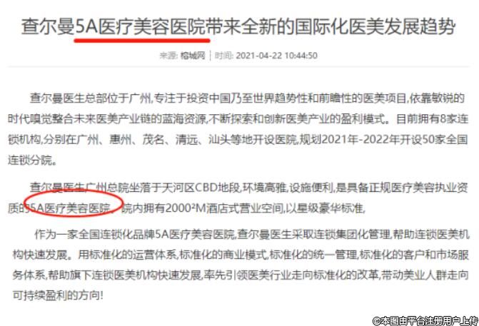 查爾曼醫(yī)生連鎖集團(tuán)關(guān)于獲評5A醫(yī)療美容醫(yī)院虛假宣傳網(wǎng)頁