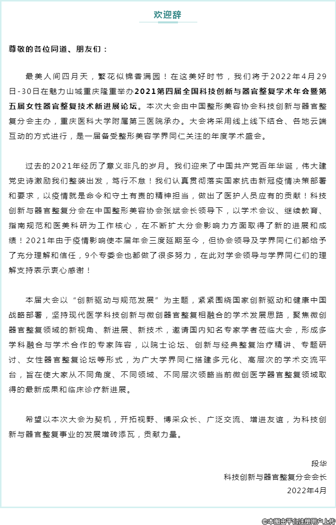 首頁 // 醫(yī)美會議 // 2022.4.29-30 重慶 2021第四屆全國科技創(chuàng)新與器官整復(fù)學(xué)術(shù)年會暨第五屆女性器官整復(fù)新進(jìn)展論壇通知