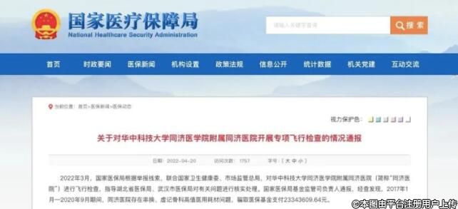 國(guó)家醫(yī)保局通報(bào),2017年1月至2020年9月期間,華中科技大學(xué)同濟(jì)醫(yī)學(xué)院附屬同濟(jì)醫(yī)院存在串換、虛記骨科高值醫(yī)用耗材問(wèn)題,騙取醫(yī)保基金支付2334.36萬(wàn)元。