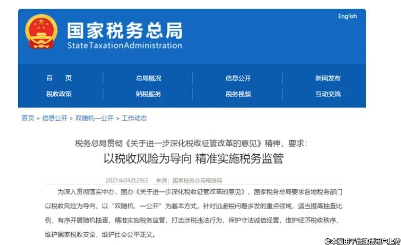 據(jù)了解,早在2021年4月29日,國(guó)家稅務(wù)總局官網(wǎng)發(fā)布《稅務(wù)總局貫徹精神,要求以稅收風(fēng)險(xiǎn)為導(dǎo)向 精準(zhǔn)實(shí)施稅務(wù)監(jiān)管》,要求各地稅務(wù)部門針對(duì)逃避稅問(wèn)題多發(fā)的重點(diǎn)領(lǐng)域,適當(dāng)提高抽查比例,有序開展隨機(jī)抽查,精準(zhǔn)實(shí)施稅務(wù)監(jiān)管,打擊涉稅違法行為。