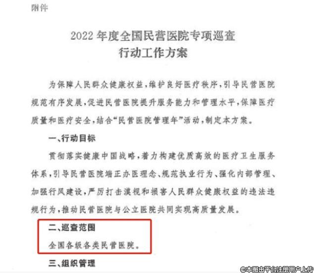 從多個(gè)渠道獲悉的文件來看,國家衛(wèi)健委發(fā)文時(shí)提到的巡查范圍為“全國各級(jí)各類民營醫(yī)院”,但又補(bǔ)充提到“要實(shí)現(xiàn)轄區(qū)內(nèi)二級(jí)以上民營醫(yī)院和50張床位以上民營醫(yī)院全覆蓋”。