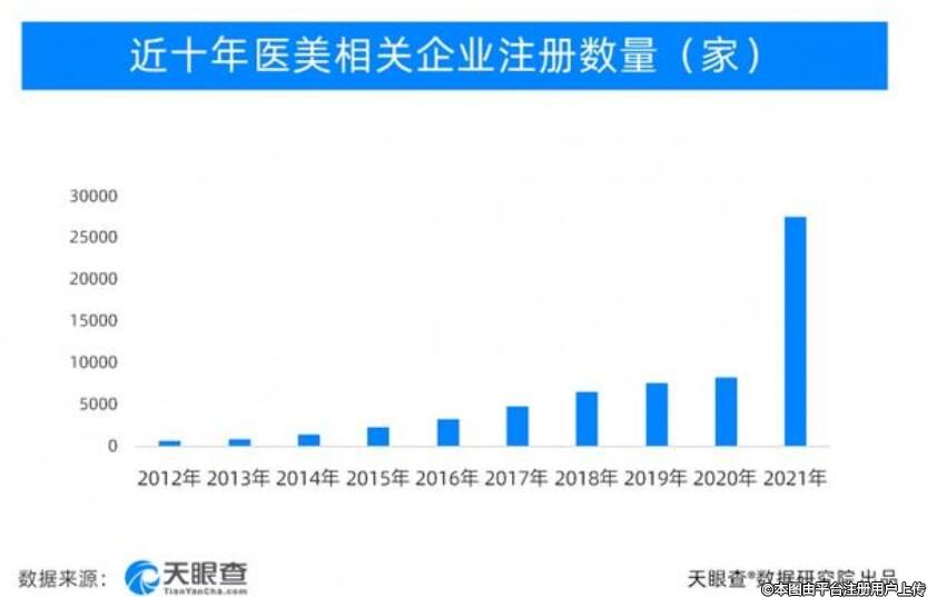 據(jù)相關(guān)數(shù)據(jù)顯示,我國目前醫(yī)美相關(guān)的企業(yè)就有8萬余家。受疫情影響,醫(yī)美機構(gòu)注冊2020年有所減緩。可是疫情得到控制之后,盡管有監(jiān)管嚴年,醫(yī)美機構(gòu)新增的速度還是快速增長了。其中,2021年新增注冊企業(yè)2.8萬家,增速達70.8%;