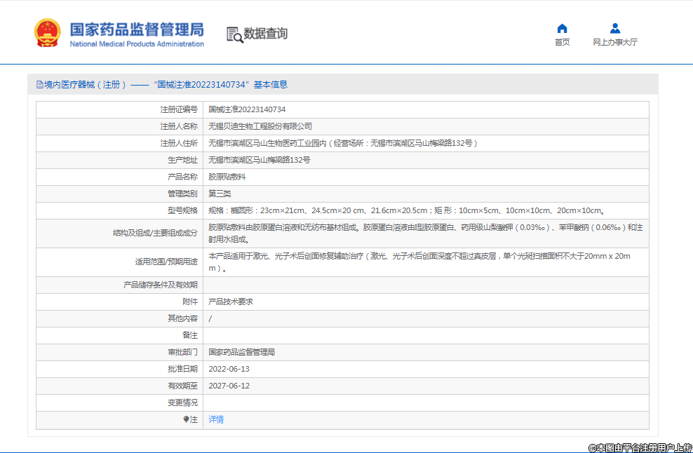 2022年6月13日,無錫貝迪生物工程股份有限公司(以下簡稱“貝迪生物”)申報的“膠原貼敷料”正式獲得國家藥監(jiān)局批準,注冊證號:國械注準20223140734。