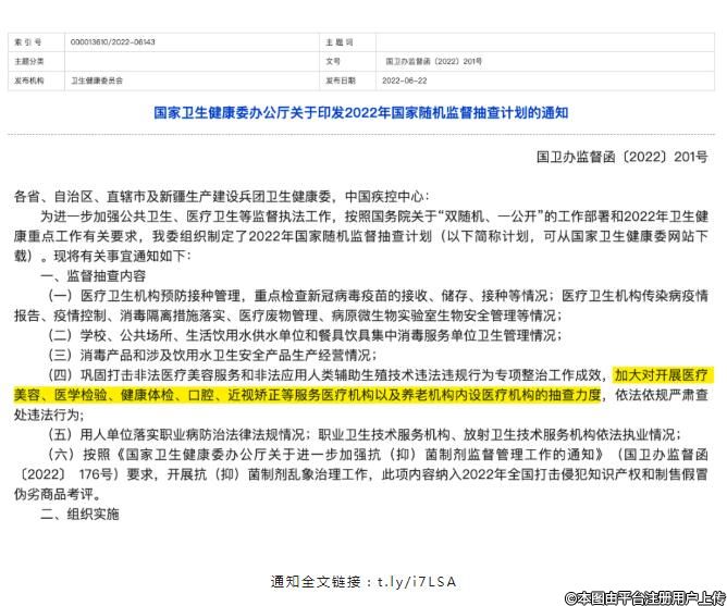 6月22日,國家衛(wèi)生健康委辦公廳印發(fā)2022年國家隨機監(jiān)督抽查計劃,監(jiān)督抽查內(nèi)容包括:醫(yī)療衛(wèi)生機構預防接種管理,重點檢查新冠病毒疫苗的接收、儲存、接種等情況;醫(yī)療衛(wèi)生機構傳染病疫情報告、疫情控制、消毒隔離措施落實、醫(yī)療廢物管理、病原微生物實驗室生物安全管理等情況;鞏固打擊非法醫(yī)療美容服務和非法應用人類輔助生殖技術違法違規(guī)行為專項整治工作成效,加大對開展醫(yī)療美容、醫(yī)學檢驗、健康體檢、口腔、近視矯正等服務醫(yī)療機構以及養(yǎng)老機構內(nèi)設醫(yī)療機構的抽查力度,依法依規(guī)嚴肅查處違法行為。