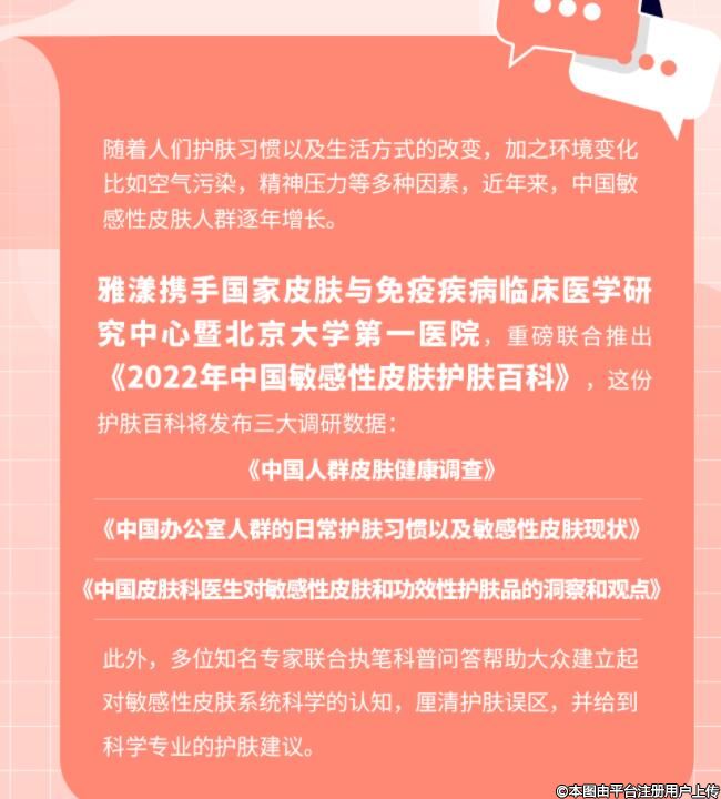 雅漾攜手國家皮膚與免疫疾病臨床醫(yī)學(xué)研究中心暨北京大學(xué)第一醫(yī)院,聯(lián)合推出《2022年中國敏感性皮膚護(hù)膚百科》,這份護(hù)膚百科將發(fā)布三大調(diào)研數(shù)據(jù):《中國人群皮膚健康調(diào)查》《中國辦公室人群的日常護(hù)膚習(xí)慣以及敏感性皮膚現(xiàn)狀》《中國皮膚科醫(yī)生對敏感性皮膚和功效性護(hù)膚品的洞察和觀點》。