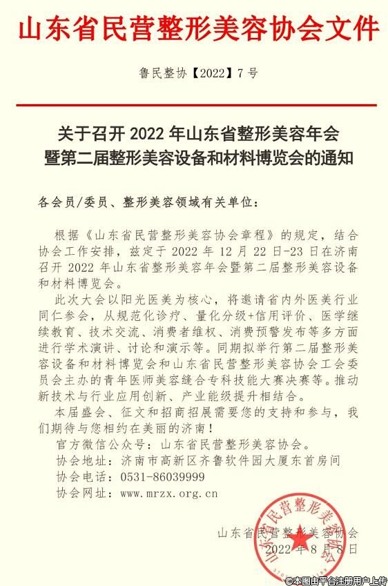 根據(jù)《山東省民營整形美容協(xié)會章程》的規(guī)定,結合協(xié)會工作安排,茲定于2022年12月 22日-23日在濟南召開2022年山東省整形美容年會暨第二屆整形美容設備和材料博覽會。