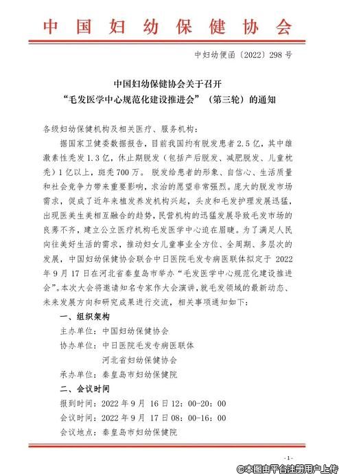 為了滿足人民向往美好生活的需求,推動婦女兒童事業(yè)全方位、全周期、多層次的發(fā)展,中國婦幼保健協(xié)會聯(lián)合中日醫(yī)院毛發(fā)專病醫(yī)聯(lián)體擬定于2022年9月17日在河北省秦皇島市共同舉辦“毛發(fā)醫(yī)學(xué)中心規(guī)范化建設(shè)推進會”。