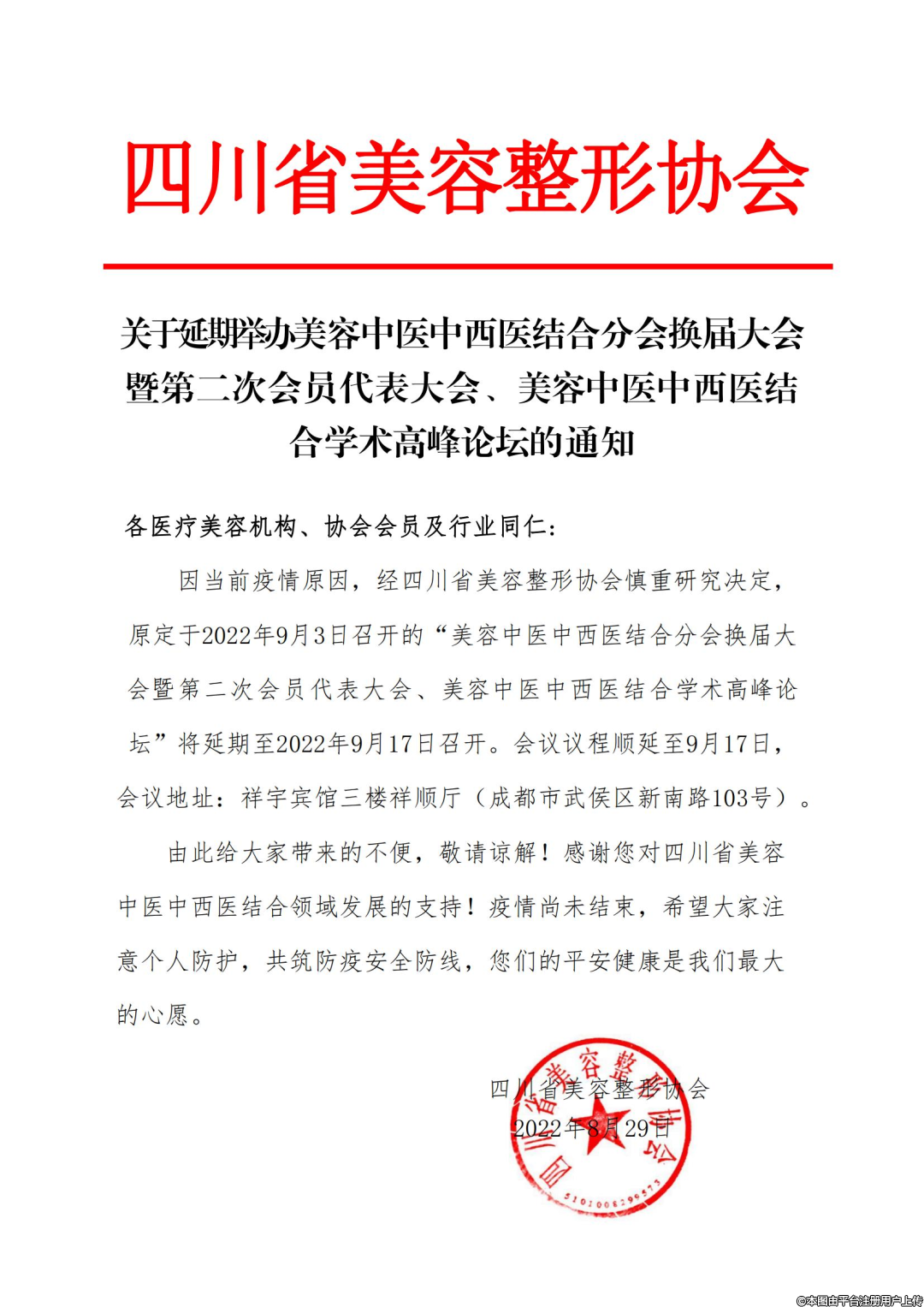 因當(dāng)前疫情原因,經(jīng)四川省美容整形協(xié)會慎重研究決定,原定于2022年9月3日召開的“美容中醫(yī)西醫(yī)結(jié)合分會換屆大會暨第二次會員代表大會、美容中醫(yī)西醫(yī)結(jié)合學(xué)術(shù)高峰論壇”將延期至2022年9月17日召開。