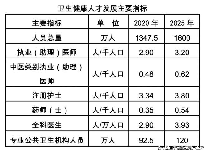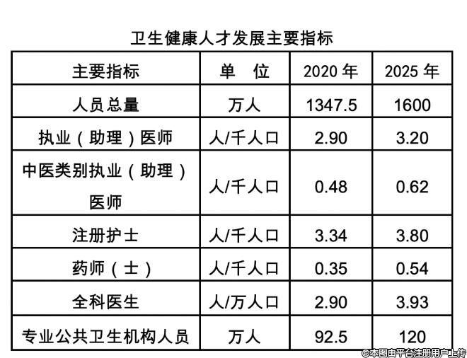 ——人才資源總量穩(wěn)步增長(zhǎng)。到2025年,衛(wèi)生健康人員總量達(dá)到1600萬人,每千人口執(zhí)業(yè)(助理)醫(yī)師數(shù)達(dá)到3.20人(其中中醫(yī)類別0.62人)、每千人口注冊(cè)護(hù)士數(shù)達(dá)到3.80人、每千人口藥師(士)數(shù)達(dá)到0.54人,每萬人口全科醫(yī)生數(shù)達(dá)到3.93人,專業(yè)公共衛(wèi)生機(jī)構(gòu)人員數(shù)增長(zhǎng)到120萬人。
