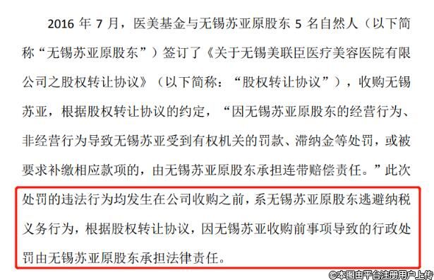 2016年7月,醫(yī)美基金與無錫蘇亞原股東5名自然人(以下簡稱“無錫蘇亞原股東”)簽訂了《關于無錫美聯(lián)臣醫(yī)療美容醫(yī)院有限公司之股權轉讓協(xié)議》,收購無錫蘇亞,根據(jù)股權轉讓協(xié)議的約定,“因無錫蘇亞原股東的經(jīng)營行為、非經(jīng)營行為導致無錫蘇亞受到有權機關的罰款、滯納金等處罰,或被要求補繳相應款項的,由無錫蘇亞原股東承擔連帶賠償責任。”