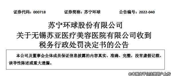 早在8月18日,蘇寧環(huán)球就發(fā)布了關于無錫蘇亞醫(yī)療美容醫(yī)院有限公司收到稅務行政處罰事項告知書的公告,強調(diào)“此次擬處罰的違法行為均發(fā)生在公司收購之前,系無錫蘇亞原股東逃避納稅義務行為,根據(jù)股權轉讓協(xié)議,因無錫蘇亞收購前事項導致的行政處罰由無錫蘇亞原股東承擔法律責任。”收到處罰決定書之后,蘇寧環(huán)球再次強調(diào)此次處罰的違法行為發(fā)生在公司收購之前,由無錫蘇亞原股東承擔法律責任。