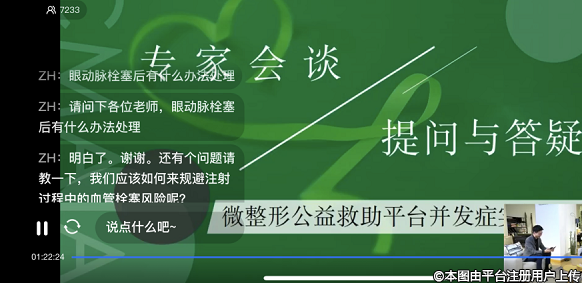專家會(huì)談最后,線上多位聽眾提出了“眼動(dòng)脈栓塞后有什么辦法處理?”、“應(yīng)該如何來(lái)規(guī)避注射過(guò)程中的血管栓塞風(fēng)險(xiǎn)?”、“肉毒素過(guò)敏應(yīng)如何預(yù)防和處理?”等問(wèn)題,郭波教授結(jié)合實(shí)際案例解答了聽眾提出的困惑與問(wèn)題。