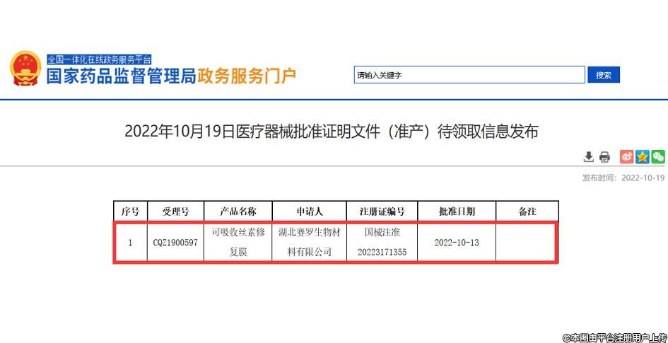 近日,國藥監(jiān)局消息,湖北賽羅生物材料有限公司(以下簡稱“賽羅生物”)研發(fā)申報(bào)的“可吸收絲素修復(fù)膜”成功獲NMPA批準(zhǔn)上市,注冊證編號:國械注準(zhǔn)20223171355。(來源:NMPA)
