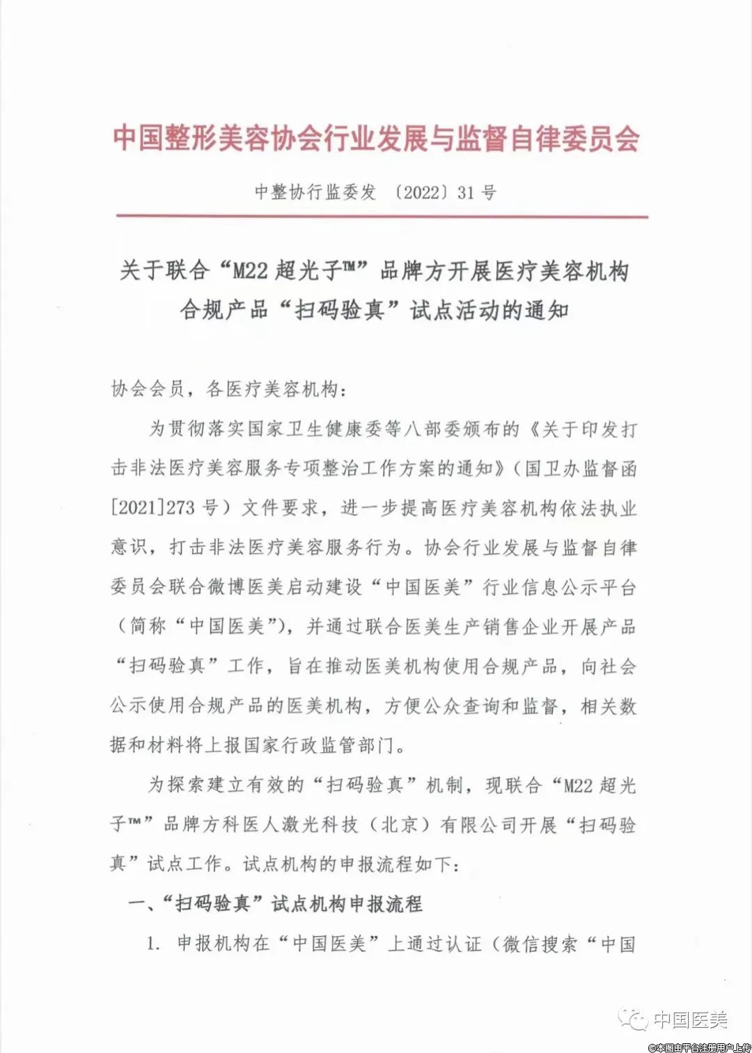 關于聯(lián)合“M22超光子™”品牌方開展醫(yī)療美容機構合規(guī)產(chǎn)品“掃碼驗真”試點活動的通知