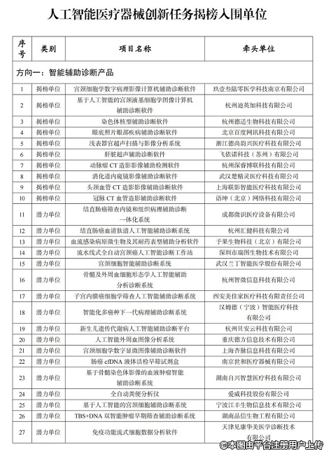 工信部&藥監(jiān)局聯(lián)合發(fā)布《人工智能醫(yī)療器械創(chuàng)新任務揭榜入圍單位》