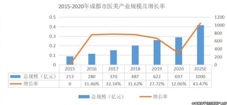 2015年~2020年成都市醫(yī)美產(chǎn)業(yè)規(guī)模及增長率