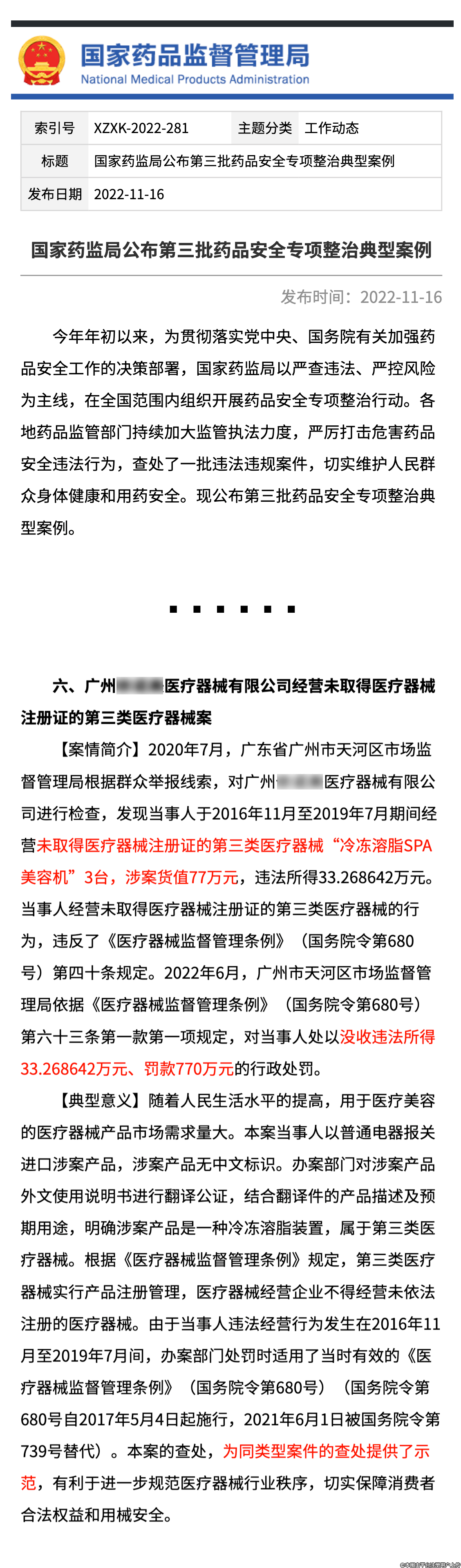 示范案例:經(jīng)營無證醫(yī)美三類械 → 貨值十倍罰款 770 萬