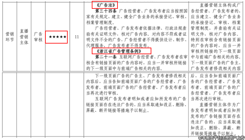 內(nèi)容概括:第11點主要介紹廣告審核的相關(guān)情況,根據(jù)《廣告法》《浙江省廣告管理條例》的相關(guān)條例,直播營銷主體應該嚴格按照要求發(fā)布相關(guān)內(nèi)容,針對互聯(lián)網(wǎng)一級頁面、二級頁面全部審核,如果發(fā)現(xiàn)明顯違規(guī)行為應該當采取通知改正、刪除、屏蔽、斷開鏈接等措施予以制止。