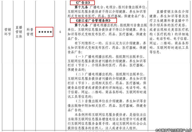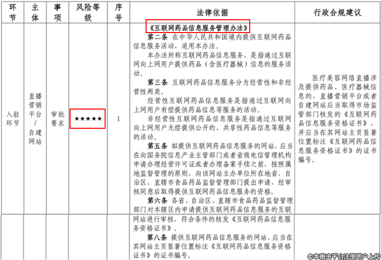 內(nèi)容概括:第1條主要表述,醫(yī)美機構(gòu)如果做直播涉及到藥品、醫(yī)療器械信息,無論自建平臺還是入駐平臺,首先需要取得市場監(jiān)管部門的《互聯(lián)網(wǎng)藥品信息服務資格證書》后并在顯著部位標準證書編號方便消費者查看。