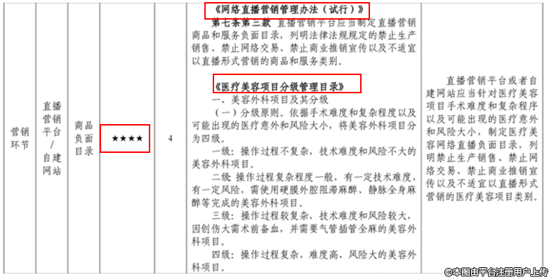 內(nèi)容概括:第4點主要表述醫(yī)美機構(gòu)在互聯(lián)網(wǎng)直播時需要設(shè)置醫(yī)美商品負面目錄,其設(shè)置的依據(jù)為《醫(yī)療美容項目分級管理目錄》。商品負面目錄會禁止部分項目的交易、宣傳、直播等,給消費者明確。