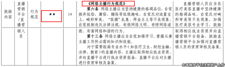 內(nèi)容概括:第14點主要強調(diào)加強主播的行為規(guī)范,針對較高專業(yè)水平(如醫(yī)療衛(wèi)生、財經(jīng)金融、法律、教育)的直播內(nèi)容,主播應取得相應執(zhí)業(yè)資質(zhì),鼓勵直播營銷平臺加強對直播營銷人員的資質(zhì)審核及備案。