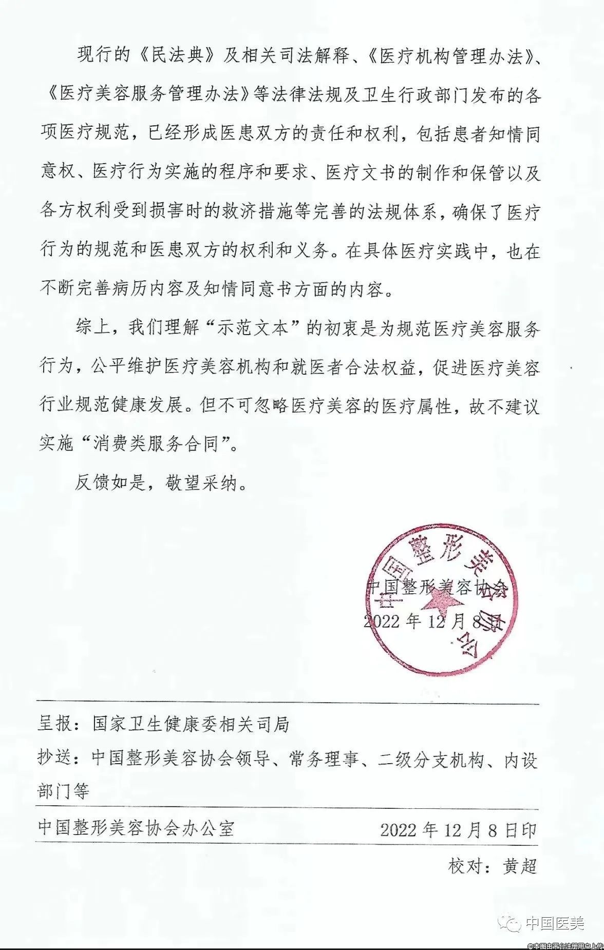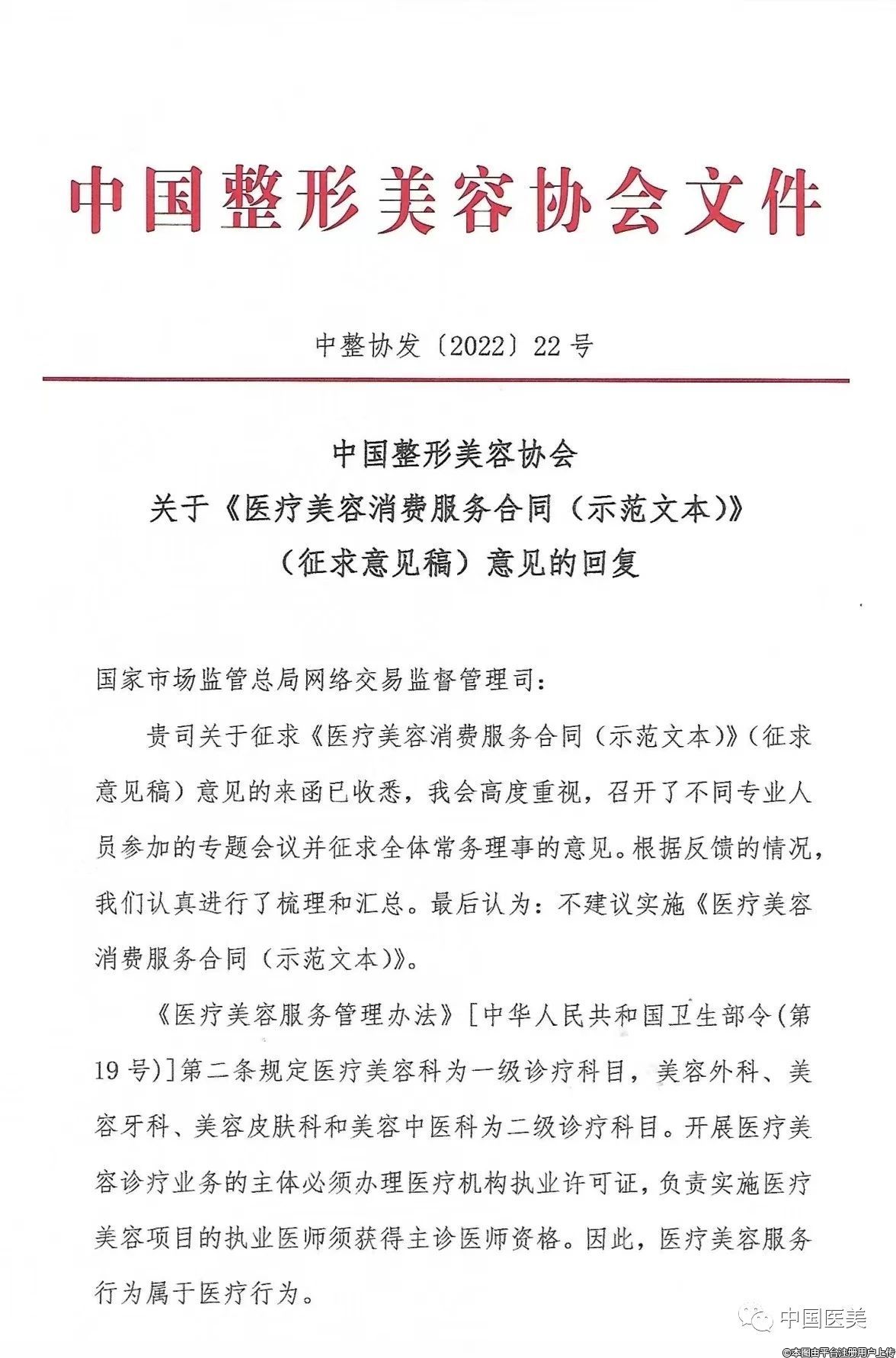 中國整形美容協(xié)會關(guān)于《醫(yī)療美容消費服務合同(示范文本)》(征求意見稿)意見的回復