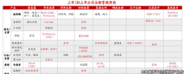 此外四環(huán)生物有合作的藍(lán)晶微生物,復(fù)銳醫(yī)療有自研的絲素蛋白、江蘇吳中有在研的愛(ài)塑美等。