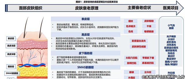 根據(jù)機(jī)構(gòu)真金白銀的態(tài)度,他們依次看好愛(ài)美客、華熙生物和貝泰妮、華東醫(yī)藥、昊海生科、魯商發(fā)展、朗姿股份、水羊股份。分析醫(yī)美行業(yè),我們先需要了解皮膚衰老的邏輯: