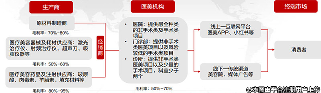 中游為醫(yī)美機(jī)構(gòu),主要包括公立醫(yī)院、大型連鎖醫(yī)院,中小型民營(yíng)企業(yè)以及小型私人診所,平均毛利率50%,平均凈利率約10%。