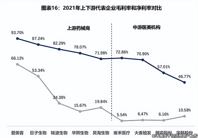 上游主要包括玻尿酸、肉毒素、膠原蛋白等原材料,以及各種醫(yī)療設(shè)備等器械,平均毛利率可達(dá)90%,平均凈利率可達(dá)30%,簡(jiǎn)直是印鈔機(jī),因此上游成為產(chǎn)業(yè)鏈中利潤(rùn)最高的一環(huán)。