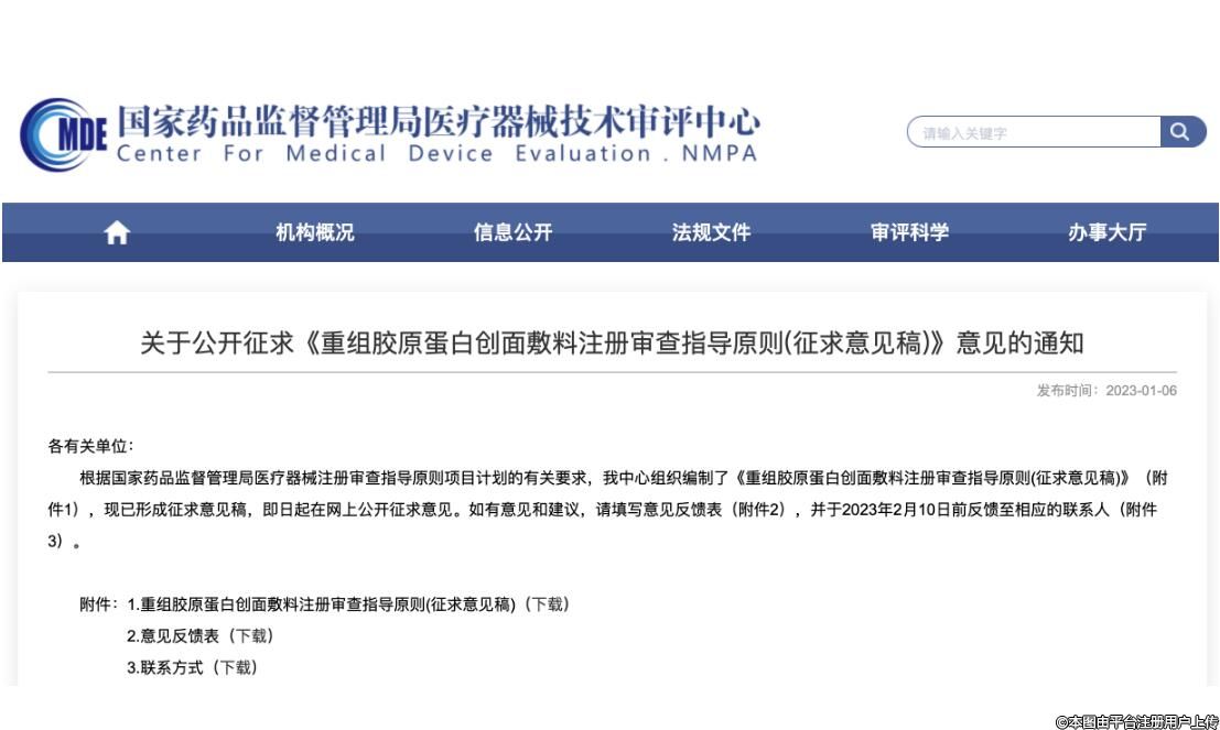 ▲《重組膠原蛋白創(chuàng)面敷料注冊(cè)審查指導(dǎo)原則(征求意見(jiàn)稿)》(來(lái)源:CMDE)