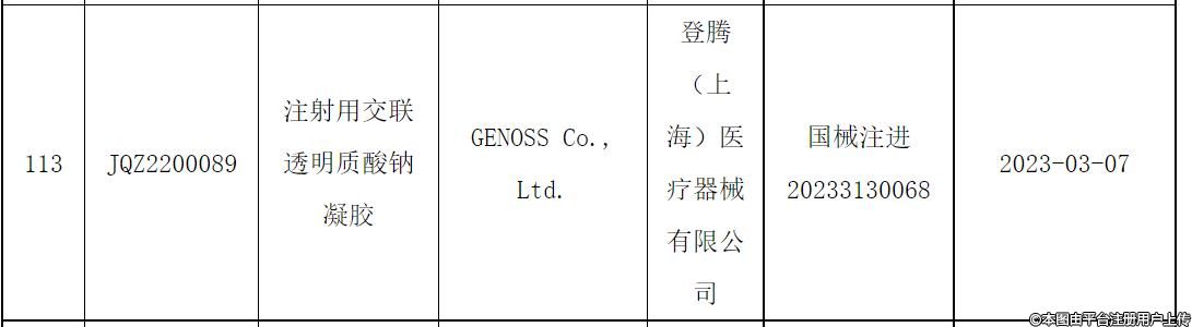 2023年03月07日,吉諾斯株式會社Genoss Co.,Ltd.(以下簡稱“Genoss”)申報的“注射用交聯(lián)透明質(zhì)酸鈉凝膠“(商品名:Monalisa Lidocaine Filler-S)成功獲國家藥監(jiān)局批準上市,注冊證編號:國械注進20233130068,國內(nèi)代理人:登騰(上海)醫(yī)療器械有限公司。