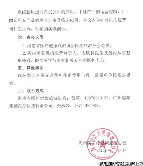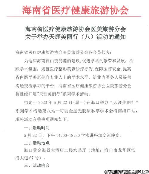 擬定于 2023 年5月22日(周一)在海口舉辦“天涯美麗行系列學(xué)術(shù)活動(dòng)第八站一可麗金星光膠原私享學(xué)術(shù)會(huì)海南??谡?,現(xiàn)將活動(dòng)有關(guān)事項(xiàng)通知如下: