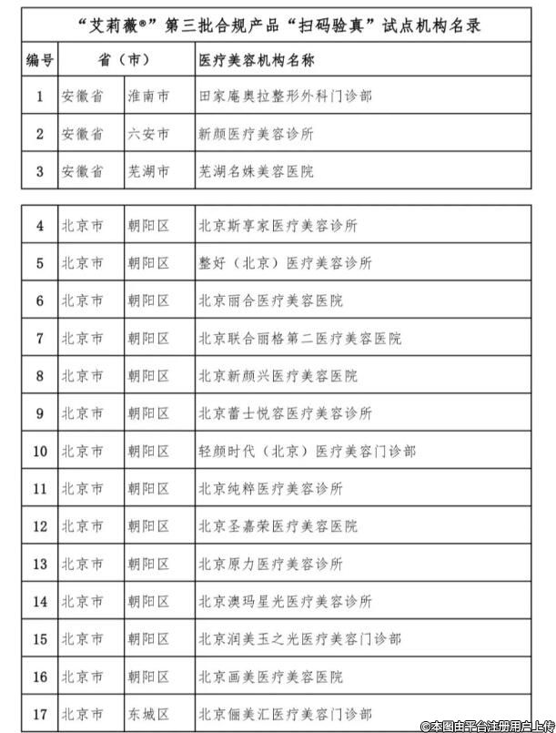 根據(jù)通知中“掃碼驗(yàn)真試點(diǎn)機(jī)構(gòu)”入選標(biāo)準(zhǔn)及流程,截至2023年8月31日審核通過108家醫(yī)療美容機(jī)構(gòu)為第三批合規(guī)產(chǎn)品“掃碼驗(yàn)真試點(diǎn)機(jī)構(gòu)”(具體名單見附件)?,F(xiàn)予以公布。
