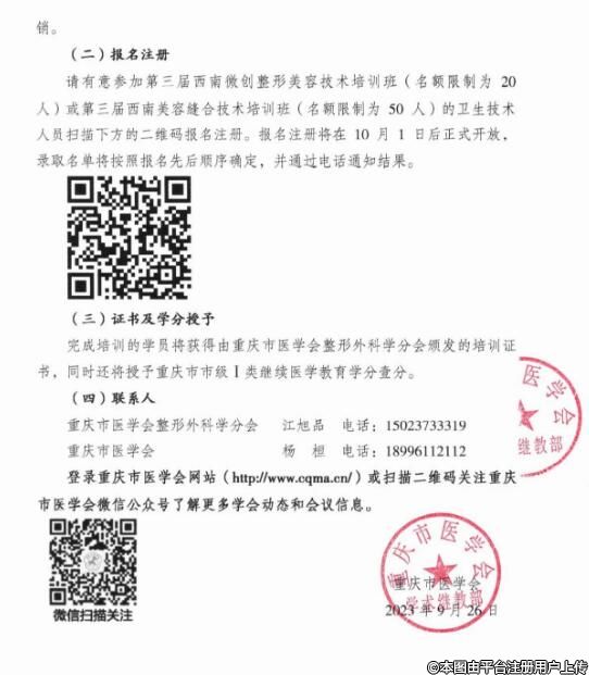 請有意參加第三屆西南微創(chuàng)整形美容技術(shù)培訓班(名額限制為20人)或第三屆西南美容縫合技術(shù)培訓班(名額限制為50人)的衛(wèi)生技術(shù)人員掃描下方的二維碼報名注冊。報名注冊將在10月1日后正式開放,錄取名單將按照報名先后順序確定,并通過電話通知結(jié)果。