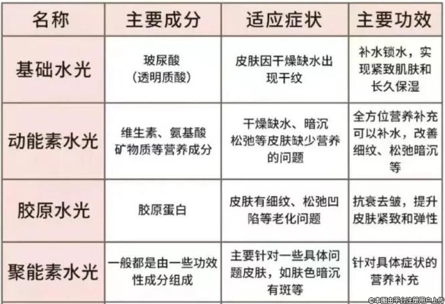 目前市面上比較常見的水光主要分為以下類型:基礎(chǔ)水光、動能素、膠原蛋白類、長效水光。