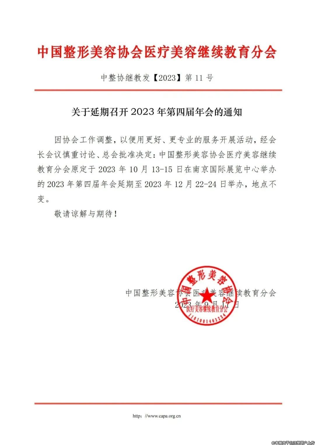 因協(xié)會工作調(diào)整,以便用更好、更專業(yè)的服務(wù)開展活動,經(jīng)會長會議慎重討論、總會批準(zhǔn)決定:中國整形美容協(xié)會醫(yī)療美容繼續(xù)教育分會原定于2023年10月13日-15日在南京國際展覽中心舉辦的2023年第四屆年會延期至2023年12月22日-24日舉辦,地點(diǎn)不變。