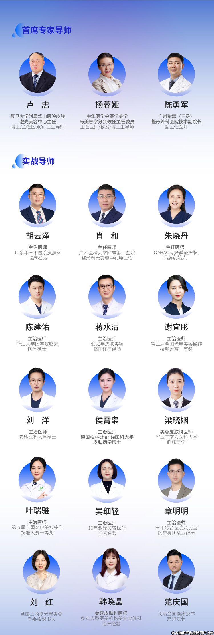 專家蒞臨,領(lǐng)銜教學(xué)!3月18日北京校區(qū),肖和、朱曉丹兩位主任醫(yī)師加入教學(xué);3月25日上海校區(qū),華山醫(yī)院皮膚科激光美容中心盧忠教授將蒞臨教學(xué),直剖斑、疤、痘、敏、抗衰老常見損容性皮膚病治療底層邏輯。同時(shí)本月會議更是加入“二氧化碳點(diǎn)陣激光”理論與實(shí)戰(zhàn)的教學(xué),強(qiáng)化激光領(lǐng)域多設(shè)備臨床動手能力。