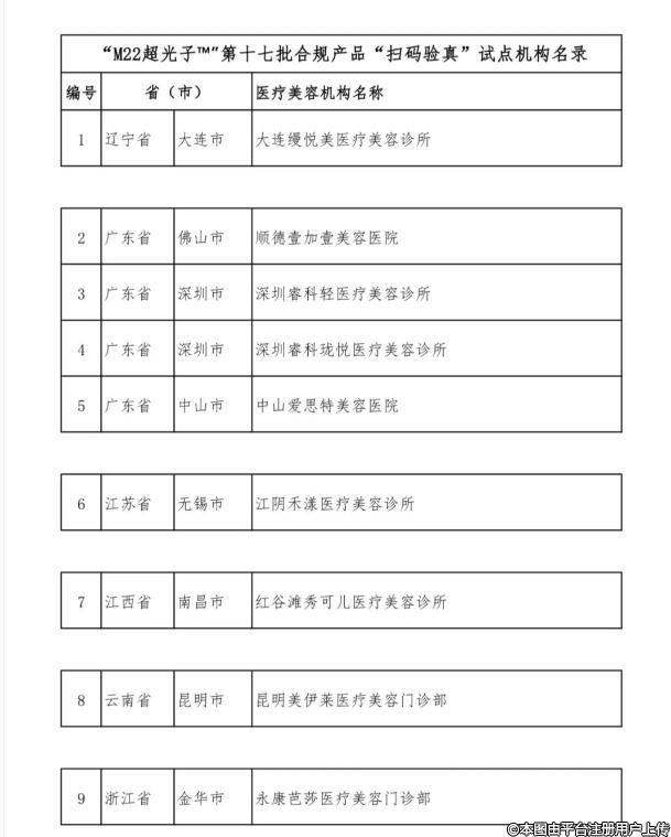 根據(jù)通知中“掃碼驗(yàn)真試點(diǎn)機(jī)構(gòu)”入選標(biāo)準(zhǔn)及流程,截至2024年3月31日審核通過(guò)9家醫(yī)療美容機(jī)構(gòu)為第十七批合規(guī)產(chǎn)品“掃碼驗(yàn)真試點(diǎn)機(jī)構(gòu)”(具體名單見(jiàn)附件)?,F(xiàn)予以公布。