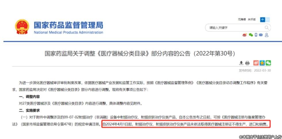 根據(jù)《國家藥監(jiān)局關于調(diào)整<醫(yī)療器械分類目錄>部分內(nèi)容的公告(2022年第30號)》(以下簡稱《公告》),4月1日起,射頻治療儀、射頻皮膚治療儀類產(chǎn)品作為第三類醫(yī)療器械管理,未依法取得醫(yī)療器械注冊證不得生產(chǎn)、進口和銷售。
