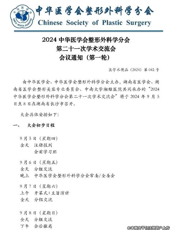 由中華醫(yī)學(xué)會、中華醫(yī)學(xué)會整形外科學(xué)分會主辦,湖南省醫(yī)學(xué)會、湖南省醫(yī)學(xué)會整形美容專業(yè)委員會、中南大學(xué)湘雅醫(yī)院共同承辦的“2024中華醫(yī)學(xué)會整形外科學(xué)分會第二十一次學(xué)術(shù)交流會”將于2024年9月5日至8日在湖南省長沙市召開。