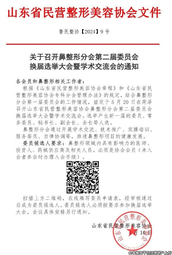 鼻整形分會通過開展學術交流、技術推廣、實操培訓、服務委員、自律協(xié)調(diào)等,推進鼻整形項目的健康發(fā)展。委員候選人要求:鼻整形領域內(nèi)具有影響力的醫(yī)師、投資人、藥械供應商及相關人員。必須是協(xié)會會員(未入會者參會時辦理入會手續(xù))。掃描下方二維碼,在線填寫委員申請表,經(jīng)審核通過后成為委員候選人,委員候選人必須按要求參加換屆選舉大會。