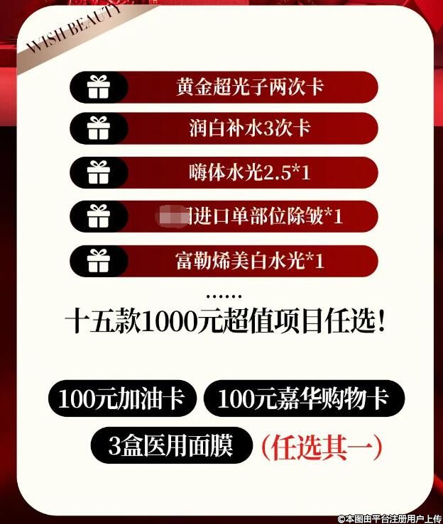 四維超頻溶脂雙下巴3次卡、面部普拉提蘋果肌提升5次卡、以色列微波暖宮3次卡、超皮秒1次卡等六大爆款項(xiàng)目任選其一。