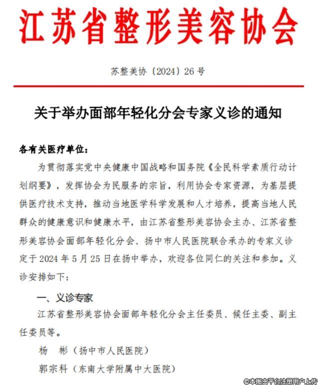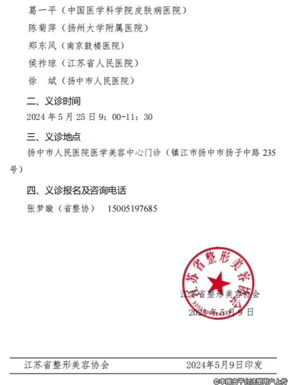 為貫徹落實黨中央健康中國戰(zhàn)略和國務院《全民科學素質行動計劃綱要》,發(fā)揮協(xié)會為民服務的宗旨,利用協(xié)會專家資源,為基層提供醫(yī)療技術支持,推動當?shù)蒯t(yī)學科學發(fā)展和人才培養(yǎng),提高當?shù)厝嗣袢罕姷慕】狄庾R和健康水平,由江蘇省整形美容協(xié)會主辦、江蘇省整形美容協(xié)會面部年輕化分會、揚中市人民醫(yī)院聯(lián)合承辦的專家義診定于2024年5月25日在揚中舉辦,歡迎各位同仁的關注和參加。義診安排如下: