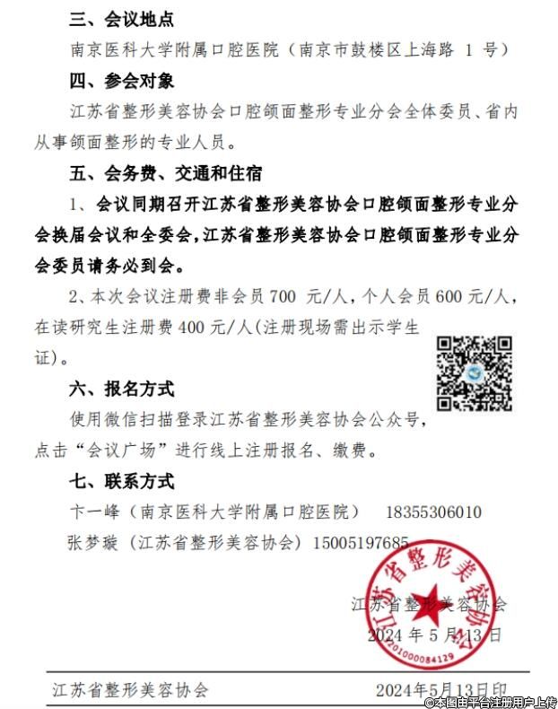 1、會議同期召開江蘇省整形美容協(xié)會口腔頜面整形專業(yè)分會換屆會議和全委會,江蘇省整形美容協(xié)會口腔頜面整形專業(yè)分會委員請務必到會。